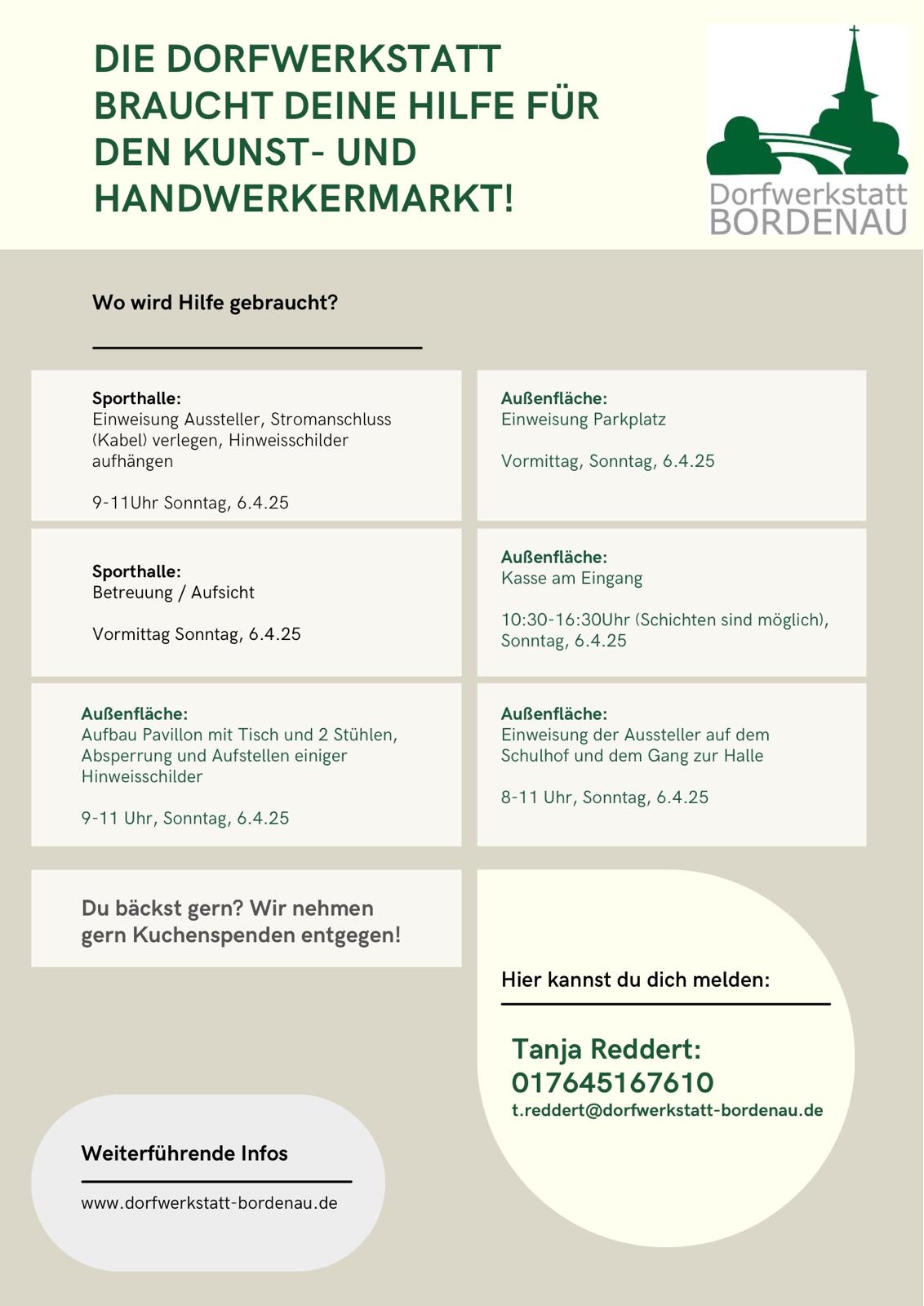 Der sechste Bordenauer Kunst- und Handwerkermarkt öffnet am Sonntag, den 10. April 2022, rund um die Bordenauer Scharnhorstschule und Sporthalle, Am Dorfteich 15. Der Start beginnt um 11.00 Uhr, und das Ende ist um 17.00 Uhr.